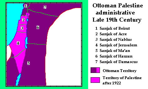 Palestina als geografische eenheid, omvattende het huidige Israël, de Gazastrook en de Westelijke Jordaanoever, bestaat pas sinds het Britse mandaat. Onder het Ottomaanse Rijk was het onderverdeeld in verschillende provincies, die ook weer grondgebied van het huidige Jordanië of Syrië en Libanon omvatten. Waar wij vóór het Britse mandaat over Palestina spreken, duiden wij daar dan ook slechts een geografisch afgebakend gebied mee aan, niet een staatkundige eenheid.